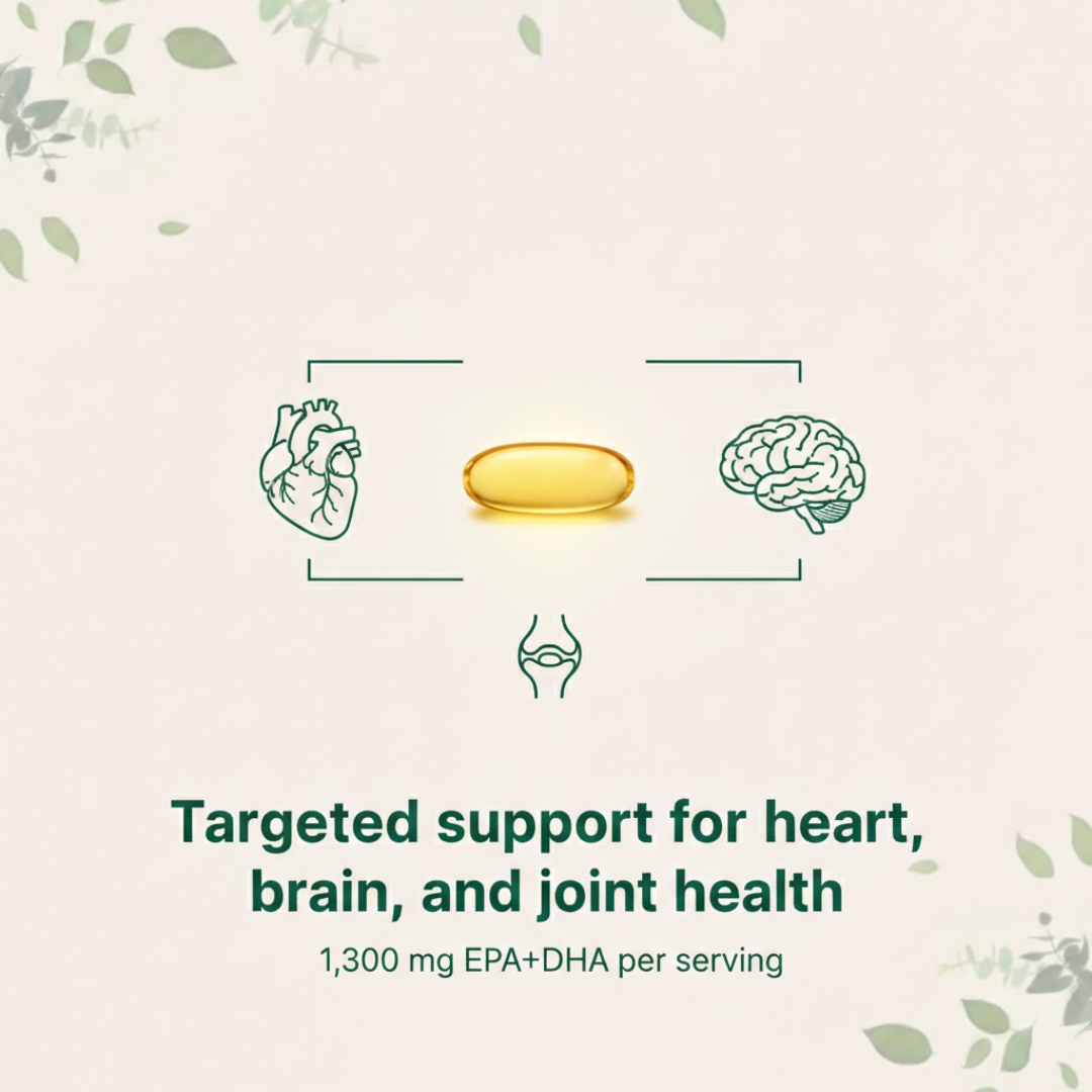 Each serving delivers 1,300 mg of EPA + DHA to support heart health, brain function, and joint comfort — all in one easy, burpless softgel.