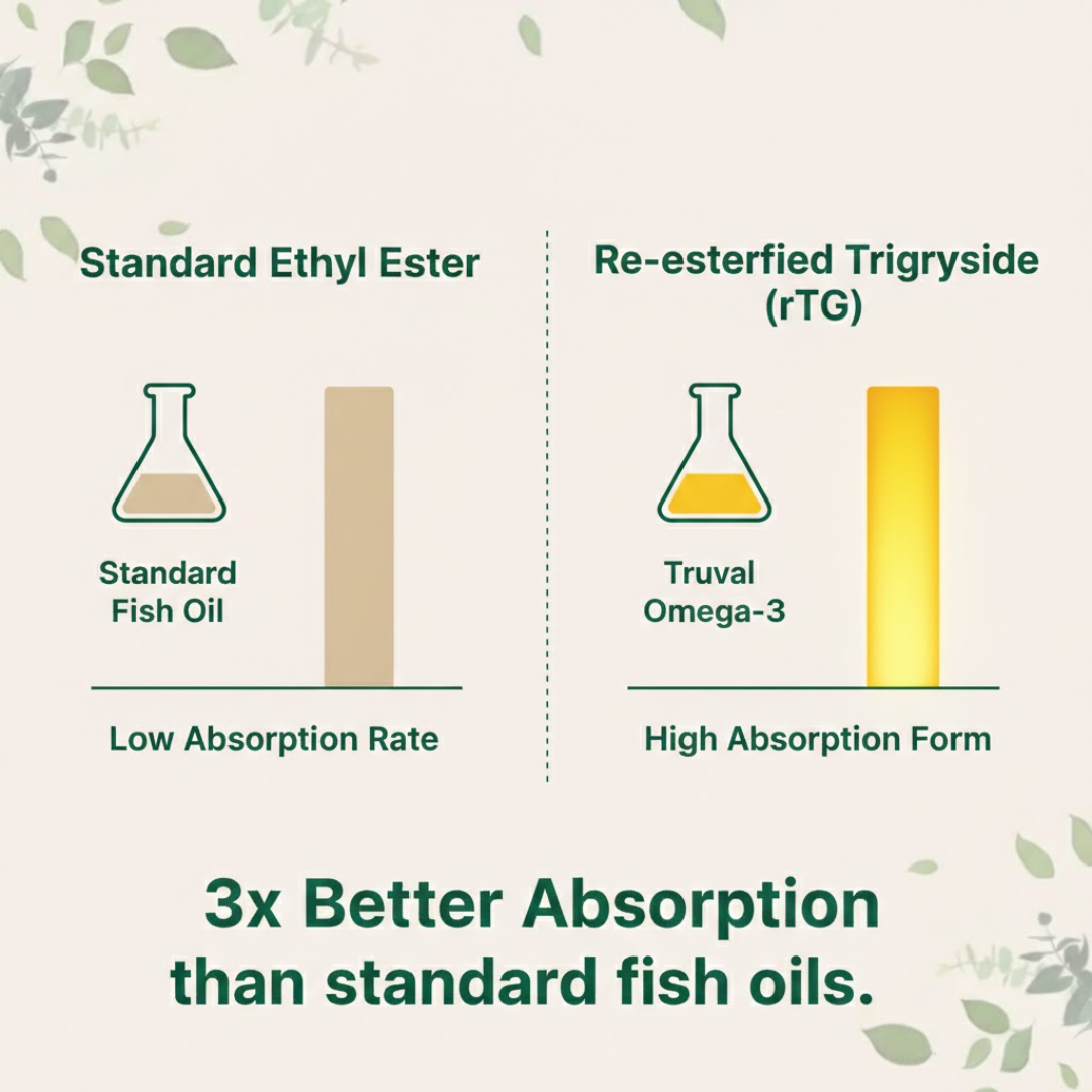 Truval Supreme Omega-3 uses a re-esterified triglyceride (rTG) form for superior absorption compared to standard fish oil. That means your body actually uses more of the EPA and DHA — so you get real results, not wasted capsules.